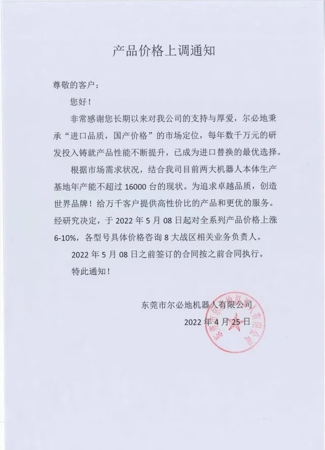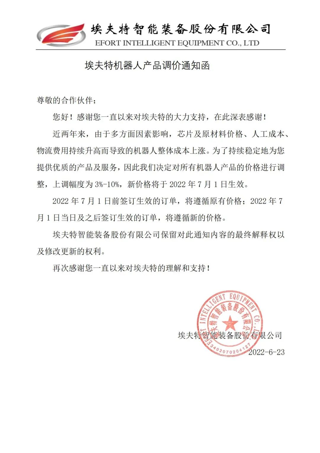 近日,國產工業機器人龍頭企業埃夫特宣布,自7月1日起,對公司所有機器人產品價格上調3%-10%。