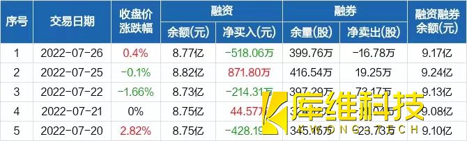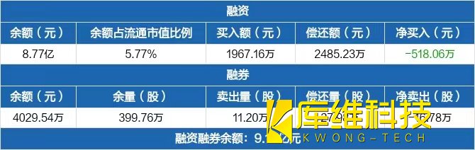 融資方面,當日融資買入1967.16萬元,融資償還2485.23萬元,融資凈償還518.06萬元。融券方面,融券賣出11.2萬股,融券償還27.98萬股,融券余量399.76萬股,融券余額4029.54萬元。融資融券余額合計9.17億元。