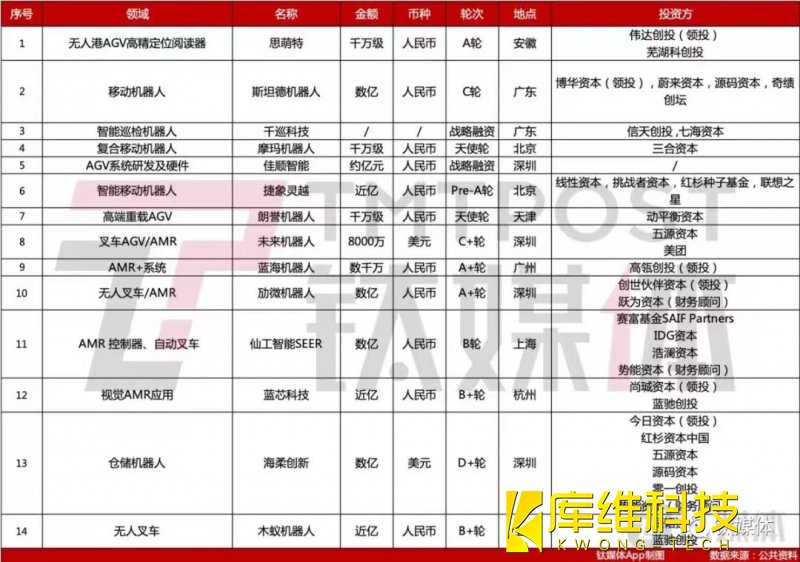 工業機器人行業投融資數量38起,其中移動機器人就發生14起,占比達到36.8%,過億的企業有5家。