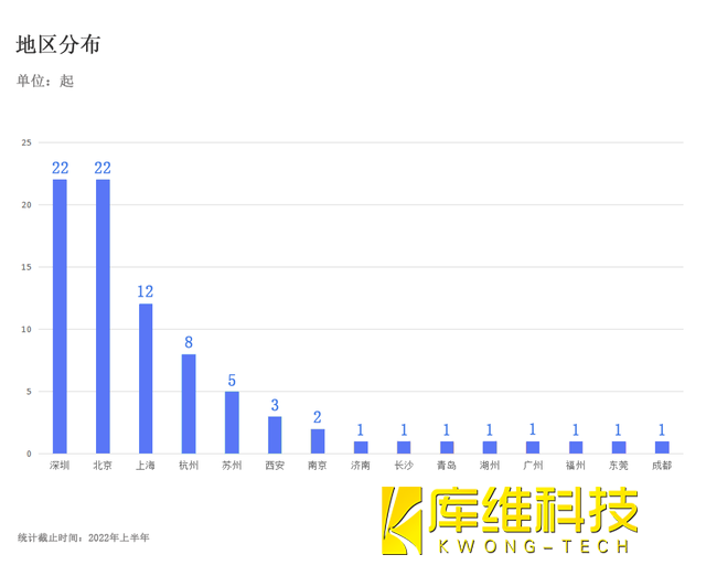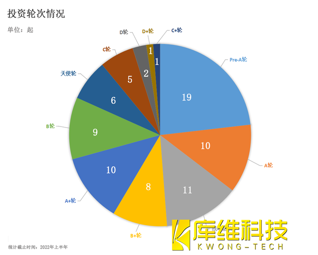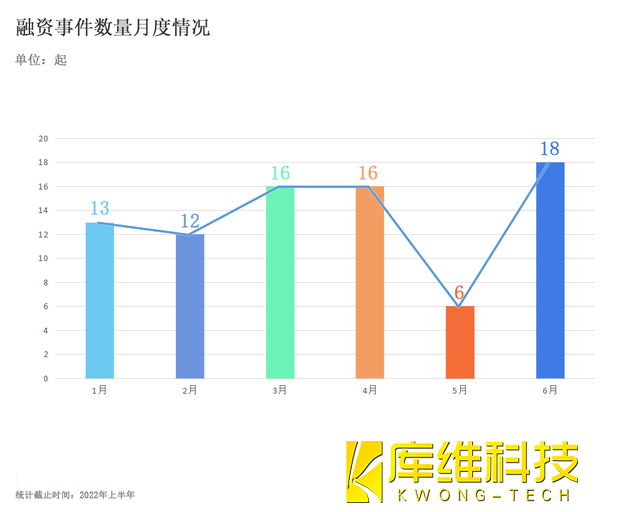 從時(shí)間維度上來看,2022上半年,融資事件的峰值出現(xiàn)在6月,發(fā)生18起,5月融資數(shù)量最少,僅為6起,平均每月發(fā)生13起融資事件。
