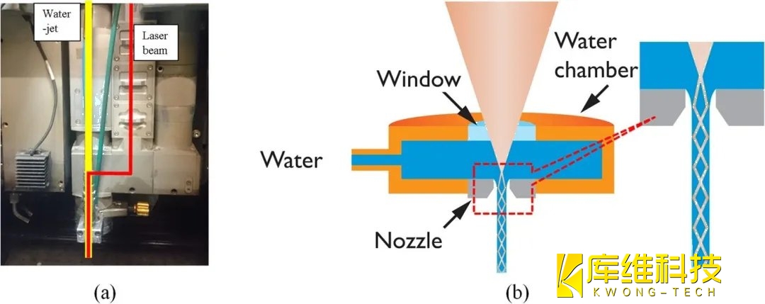 圖1(a)和圖1(b)分別顯示了水導激光系統的照片視圖和原理圖,其中激光束通常為535 nm激光,聚焦在直徑為40 ~ 150 μm的加壓水射流上。加壓的水射流作為光束導流器,通過全內反射將激光脈沖引導到激光照射區。雖然激光聚焦光斑尺寸小于水射流直徑,但由于內部反射,激光束在水射流內部均勻化,在激光照射區域內,光束和射流的直徑保持不變。