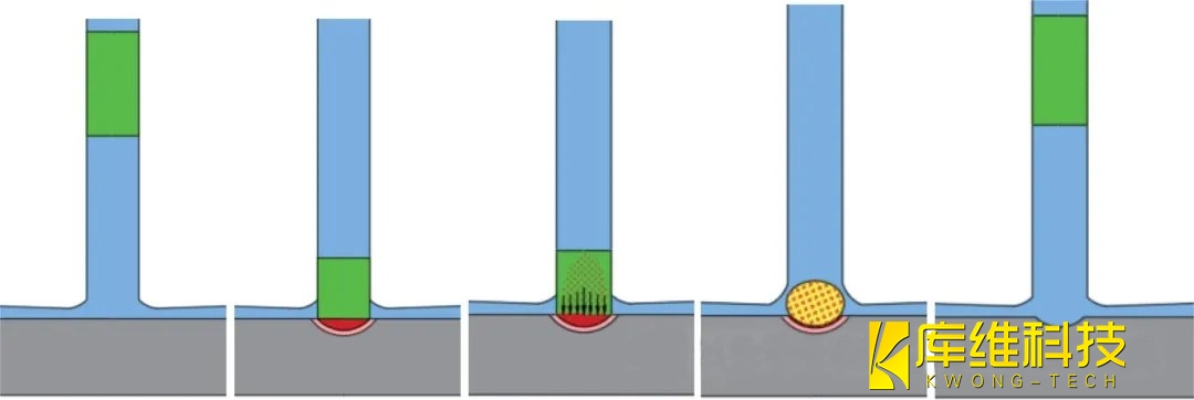 圖8給出了水導激光加工過程的合理機理。首先,通過水引導(圖8b)的激光脈沖(圖8a)與材料表面相互作用。激光與材料的相互作用(圖8b)導致輻照區內的加熱、熔化(圖8b)和輕微的汽化(圖8c)。由于脈沖長度較長(~ 150 - 250ns),部分激光束被汽化物質吸收(圖8c),導致在激光照射區上方形成等離子體(圖8d)。在這個階段,等離子體充當水射流和材料之間的中間區域(圖8d)。這種現象與激光沖擊強化所觀察到的機制類似,在這種機制中,被困在水層和襯底之間的等離子體產生了高量級的壓力波。與最先進的納秒激光與材料的相互作用相比,等離子體產生的沖擊波以及高量級的蒸汽壓力加速了熔體噴射過程。一旦等離子體開始消失,水射流與高溫激光照射的表面相互作用,表面可能仍然有一層薄薄的殘余熔體。水射流與高溫激光照射區相互作用導致水的爆炸性汽化,產生脈沖沖擊壓力,導致激光照射區殘余熔體層被清除。因此,在水導激光鉆孔上沒有觀察到重鑄區或熱影響區。