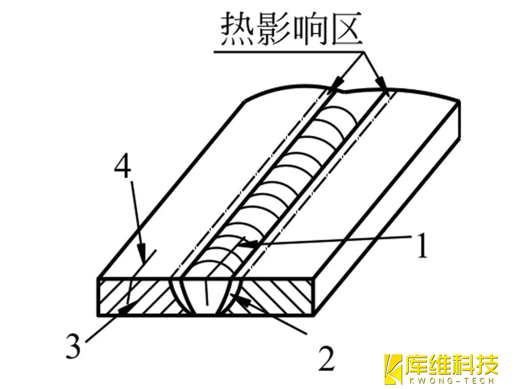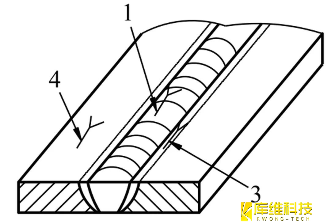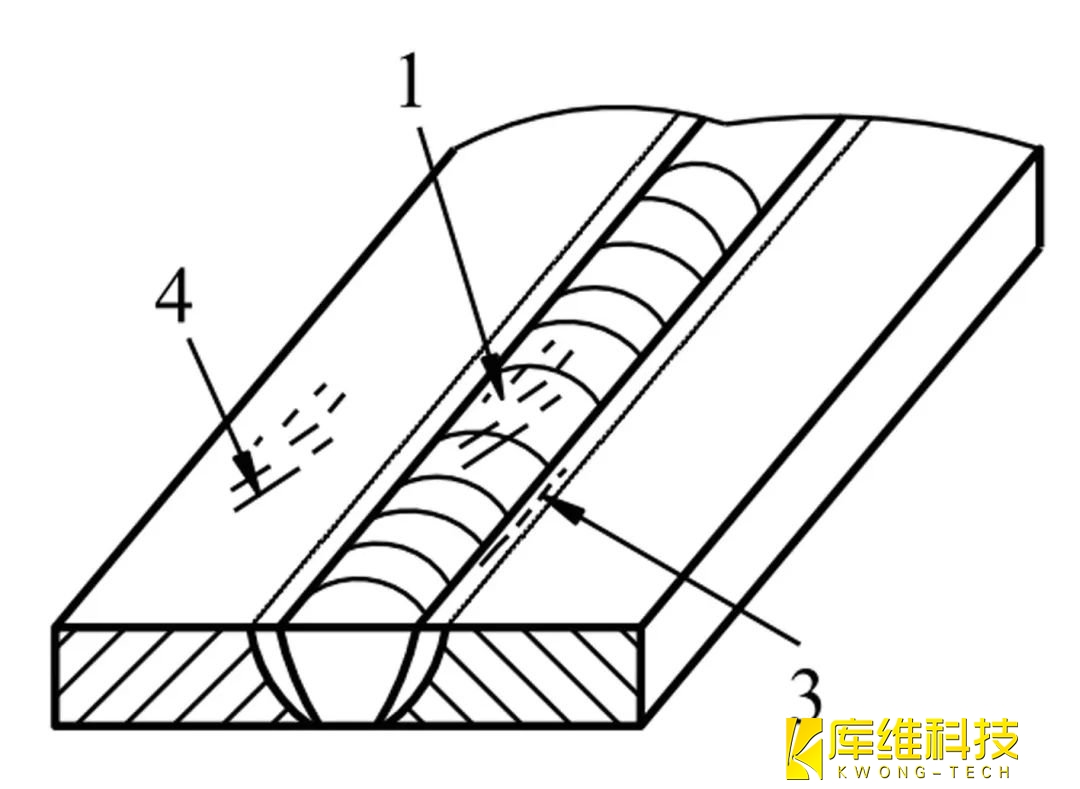 基本上與焊縫軸線平行的裂紋,可能存在于焊縫金屬中(1)、熔合線上(2)、熱影響區(qū)(3)以及母材金屬中(4)。