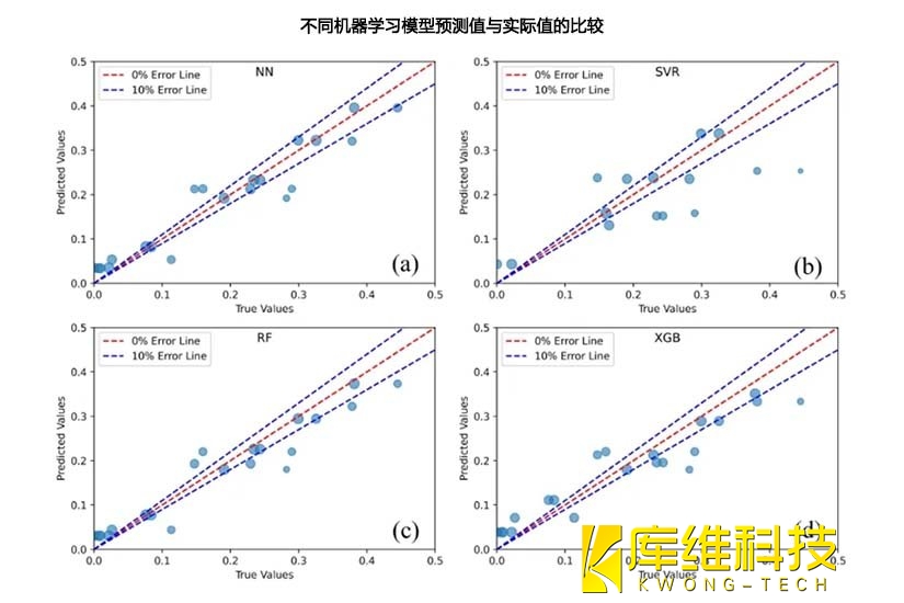 從實(shí)驗(yàn)流程來(lái)看,整個(gè)過(guò)程分為清晰的三個(gè)階段,實(shí)驗(yàn)階段收集原始數(shù)據(jù);預(yù)測(cè)和優(yōu)化階段借助機(jī)器學(xué)習(xí)深挖數(shù)據(jù)關(guān)聯(lián)、找尋最優(yōu)參數(shù);驗(yàn)證和解釋階段則利用物理仿真模型為神經(jīng)網(wǎng)絡(luò)的結(jié)果 “背書(shū)”。實(shí)驗(yàn)中的樣本點(diǎn)選取也頗具講究,24 個(gè)測(cè)試集樣本點(diǎn)的數(shù)據(jù)直觀呈現(xiàn)出不同機(jī)器學(xué)習(xí)技術(shù)預(yù)測(cè)值與實(shí)際值的貼合程度。