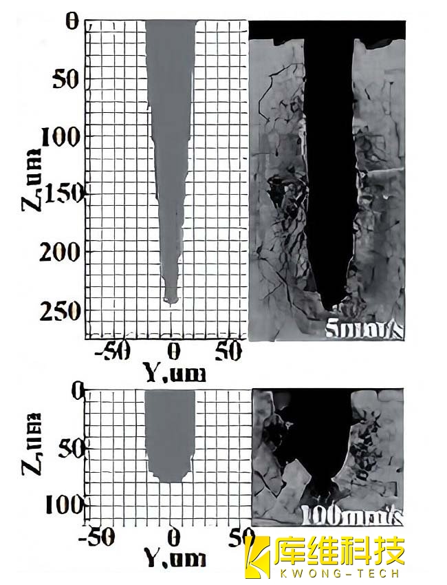 2、不同進給速度下刻劃硅仿真和實驗截面形貌對比