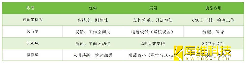 ??裝配場景??:需高精度(±0.03mm以內)、多自由度、柔性控制強與快速響應能力,推薦六軸協(xié)作機器人,適用于如電子元器件裝配等。