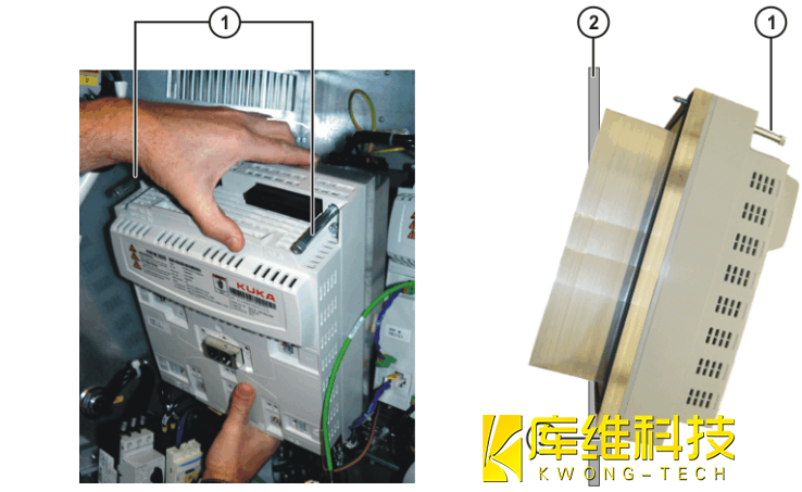注意:KPP 的重量約為 10 kg. 在 KPP 的拆裝工作中存在擠傷危險!請戴防護手套5. 將新的 KPP 插進殼體支撐角鐵 (3)里,然后將其上部掛入角鐵并擰緊(擰緊扭矩 4 Nm)6. 按照插頭和線纜說明將所有接口插入. 將插頭 X20 和 X21 鎖緊.